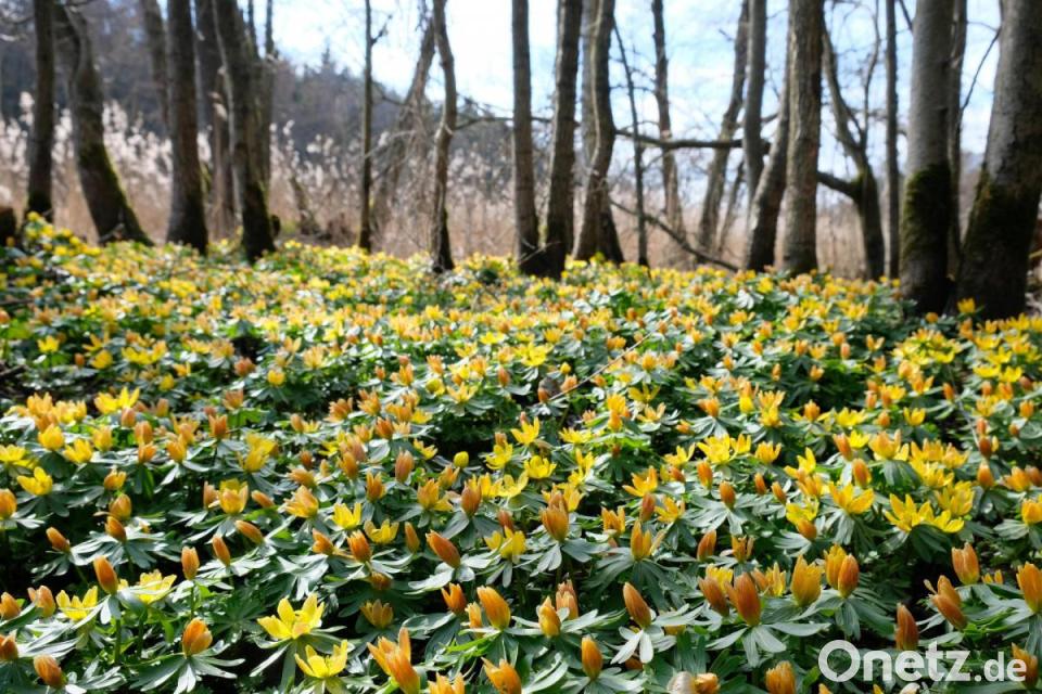 Die Winterlinge machen derzeit ihrem Namen alle Ehre. Für gewöhnlich gehören sie schon im Februar zu den ersten Frühlingsboten. Doch Schnee, Eis und Frost im April verlängern die Blütezeit der frostharten und gelb leuchtenden Frühjahrsblüher. Deshalb führt derzeit eine naturkundliche Wanderung durch den lichtdurchfluteten Bruch- und Feuchtwald entlang der Creußen zu einer Explosion der Farben. Zu bestaunen gibt es den gelben Flor der Winterlinge mit Selbstvermehrung, die verwildert und als Blütenteppiche entlang des Flussufers leuchtende Kontraste im lichten Unterholz bilden.