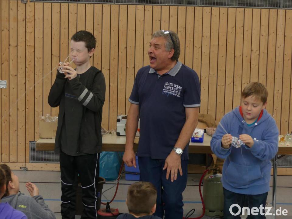 Viele Interessenten meldeten sich für einen Blasversuch mit Schwänen. Piller führte vor, wie durch das Blasen Wasser aus dem Schnabel spritzt und holte sich Jonathan und Sebastian als Freiwillige. Er verschwieg ihnen jedoch, dass sich im Hals der Schwäne ein weiteres Loch befindet, das mit einem Finger abgedeckt werden kann. So erreichte beim Blasen nicht nur ein kleiner Wasserstrahl die vor ihnen sitzenden Schüler: Zur Erheiterung der Klassengemeinschaften traf ein Rückstrahl die Gesichter der Freiwilligen.