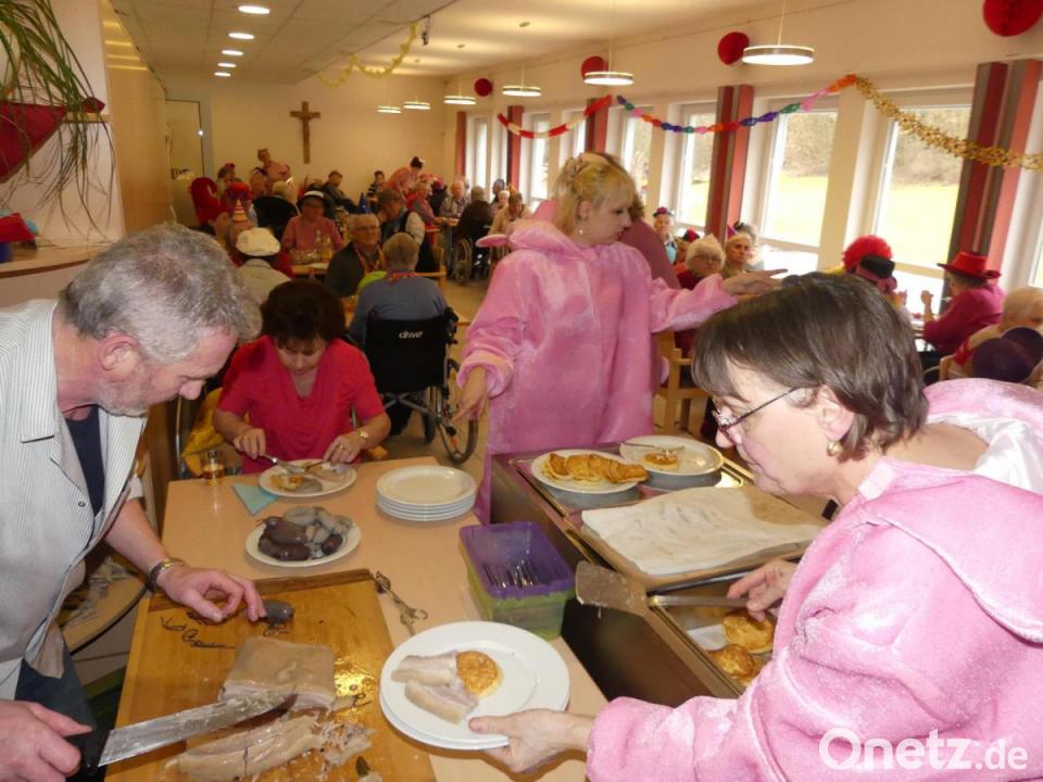 „Schlachtschüsselessen mit Faschingsgaudi und Musik“ war für Rosenmontag im BRK-Seniorenheim angekündigt. Am späten Vormittag strömten die Bewohner in den dekorierten Mehrzweckraum und das Foyer, wo sie bereits gedeckte Tische vorfanden.
