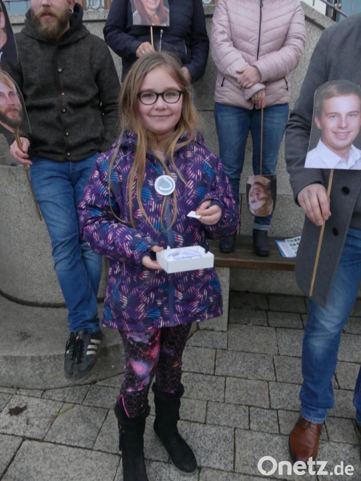 Die Treppenanlage des Rathauses nutzten die Anbieter als Bühne. Einen gewissen Werbeeffekt hatten ihre an Stäben angebrachten Konterfeis, die sie stets dem Ersteigerer überließen. Als Glücksfee wirkte die kleine Saskia, die aus einer Schachtel Papierstreifen mit den angebotenen Dienstleistungen zog. Trotz des Hinweises, dass für einen Reifenwechsel im Kfz-Gewerbe bis zu 30 Euro berechnet werden, blieb das Höchstangebot dafür bei 11 Euro. Das Angebot von sechs Euro für einen Wochenendeinkauf gab zu erkennen, dass die ältere und bewegungseingeschränkte Generation den Weg zum Rathaus nicht auf sich hatte nehmen wollen.