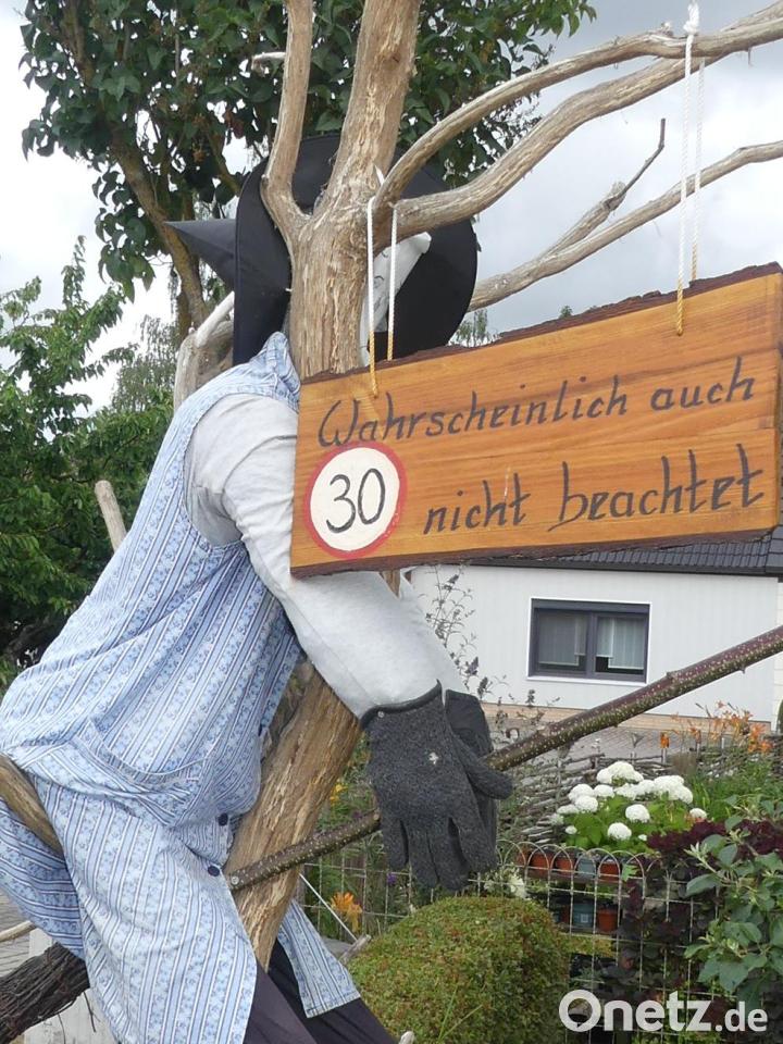 In den innerstädtischen Straßen der Rußweiherstadt ist die Geschwindigkeit in der Regel auf 30 Stundenkilometer begrenzt. Die dafür angebrachte Beschilderung wird jedoch oft nicht beachtet. Ein Anlieger bringt seinen Unmut darüber auf deutliche und zugleich erheiternde Art zum Ausdruck. Eine Hexe, für die ohnehin keine Geschwindigkeitsbegrenzung gilt, wurde durch einen Baum abgebremst. Auf einer Holztafel ist als Grund dafür angegeben: "Wahrscheinlich auch 30 nicht beachtet." Ob dies Geschwindigkeitssünder zum Ändern ihres Fahrverhaltens veranlasst? Fußgänger und Radfahrer amüsieren sich jedenfalls köstlich und finden die Idee des Konstrukteurs als geradezu genial.