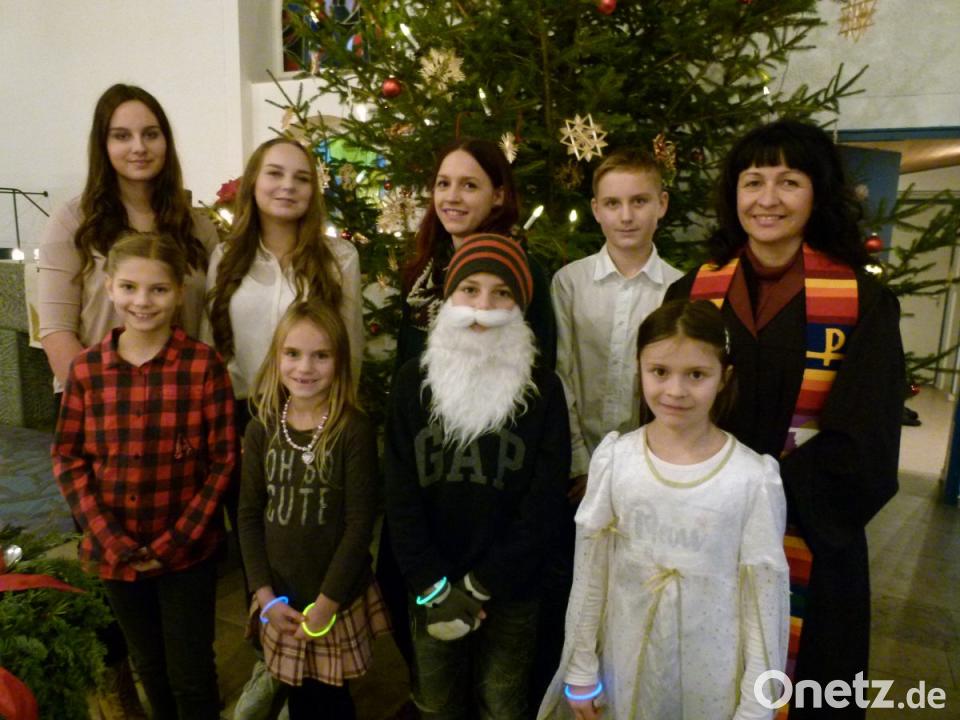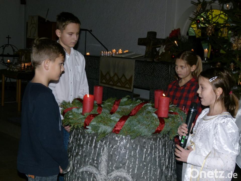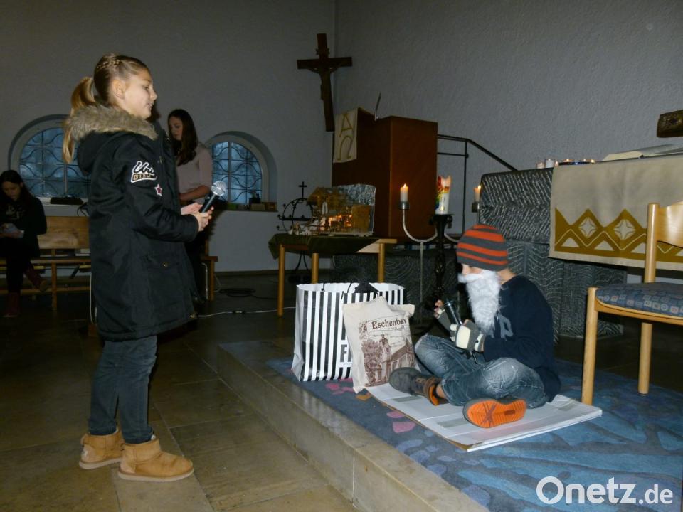Bei der etwas anderen Art des Krippenspiels entführten die Kinder ihre Zuhörer zu einer Familie, bei der an Heiligabend vor der Bescherung ein großer Mann mit Bart an der Tür läutete und um "etwas Essen oder ein bisschen Geld" bettelte. Während die nachdenkliche Tochter Amelie ein schlechtes Gewissen bekam, kramte der Papa eine Zwei-Euro-Münze aus der Tasche. Auf dem Weg zur Kirche sah Amelie den ärmlich gekleideten Mann an einer Straßenecke stehen und beobachtete, dass ihm niemand half oder auch nur schöne Weihnachten wünschte.