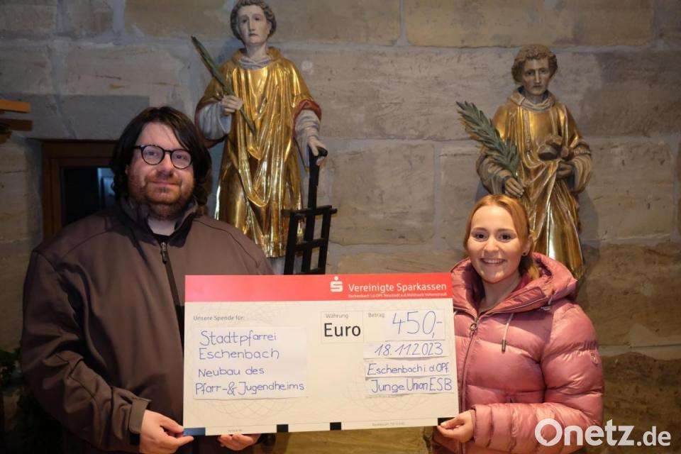 Der heilige Laurentius, Schutzpatron vieler Berufsgruppen und Kirchenpatron der Eschenbacher Stadtpfarrkirche und der heilige Stephanus waren stille Beobachter bei einer Aktion für gute Zwecke. Katharina Diertl, Ortsvorsitzende der Jungen Union, besuchte Stadtpfarrer Johannes Bosco in der Sakristei der Pfarrkirche, um eine Frohbotschaft zu überbringen. Diertl überreichte dem Ortspfarrer im Namen der JU-Vorstandschaft eine Geldspende in Höhe von 450 Euro als kleinen Beitrag für den Neubau des Pfarrheims. Die Spendensumme stammt aus dem Reingewinn der Einnahmen des JU-Bürgerfest-Standes und der JU-Servicestation beim Johannisfeuers.