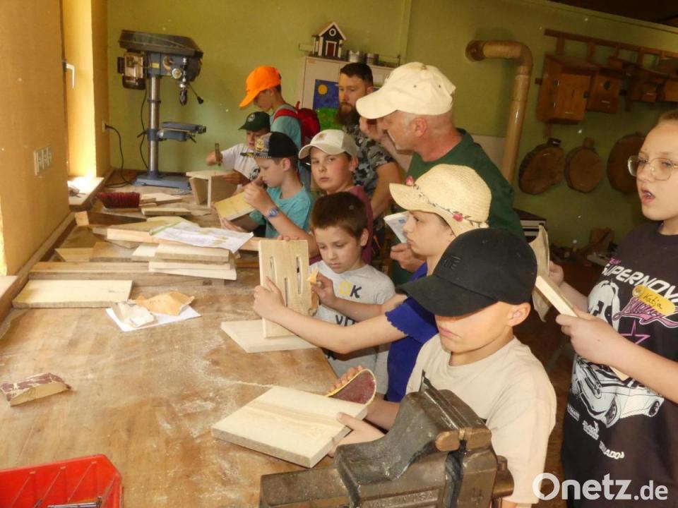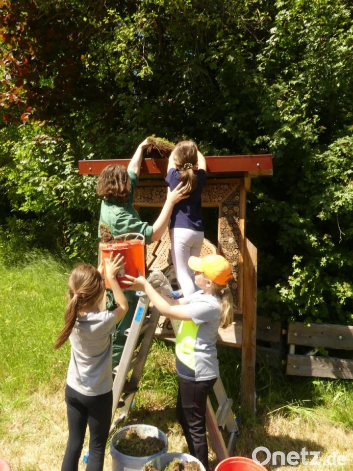 Während eine Gruppe ein Sandarium aus lehmhaltigen, ungewaschenen Sand für Erdbienen und Ameisenlöwen anlegte, beschichtete eine andere das Dach des Insektenhotels mit Matsche aus Moos und Waldboden. Emsiges Treiben herrschte im Werkraum des Gruppenheims. Hier entstanden fünf nistkastenartige Schmetterlingshäuser. Als Einflughilfe dienten etwa ein Zentimeter breite Schlitze. Für die Einrahmung des Sandariums erhielten Akazienhölzer Insektenlöcher. Die Organisatoren waren begeistert, dass der Nachmittag für die jungen "Insektenkönner" zu einem Naturerlebnis geworden war.