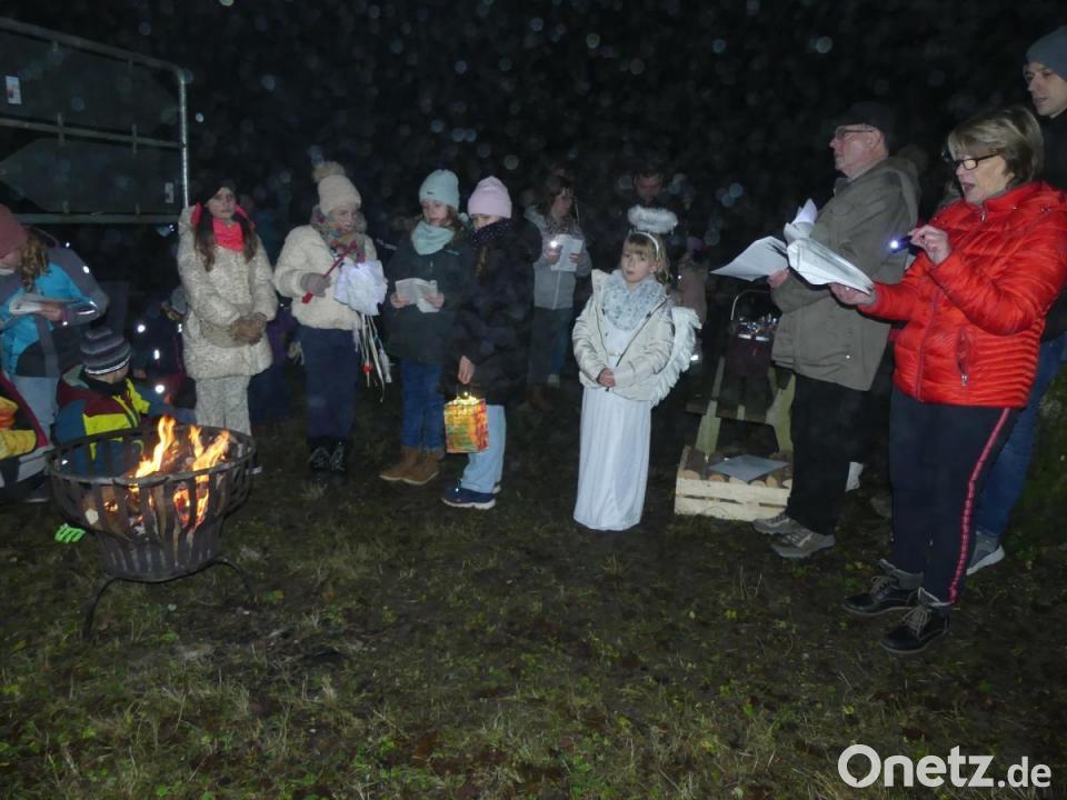 Vom Wirtsberg aus schallten Trompetenklänge hinunter zum Eschenbacher Bildungshügel. Die Kolpingsfamilie hatte zur Waldweihnacht an die Wegegabel Breitenlohe-Hotzaberg geladen. Die letzten Meter dorthin wurden zu einem Lichterzug. Die vielen Kinder, die mit ihren Eltern der stimmungsvollen Feierstätte mit Feuerschale und großem beleuchtetem Fenster zuströmten, hatten ihre Lampions vom St. Martins-Umzug dabei.