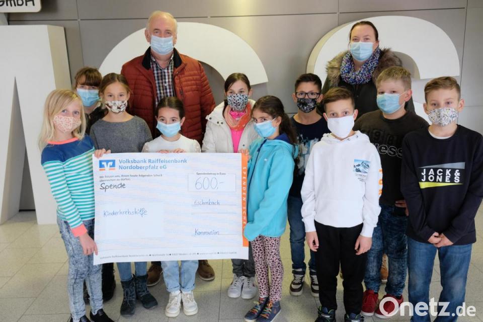 Plötzliche Schicksalsschläge in Familien schockieren und hinterlassen Spuren des Leides. Der Alltag verändert sich dramatisch. Ab diesem Moment gilt es, den betroffenen Familien zu helfen. In dieser schweren Situation hilft die Kinderkrebshilfe in der Region Oberpfalz Nord. Doch die Organisation ist auf die Hilfe vieler Institutionen und Menschen angewiesen. Dazu zählen auch die Eschenbacher Kommunionkinder. Das Dankeschön von Herbert Putzer, Vorsitzender der Kinderkrebshilfe, war bei einem Besuch in Eschenbach besonders herzlich, als die Erstkommunikanten dem Vereinschef eine Spende in Höhe von 600 Euro überreichten. Bei der Summe handelt es sich um eine Elternspende aus Anlass der Erstkommunion der 13 Buben und Mädchen.