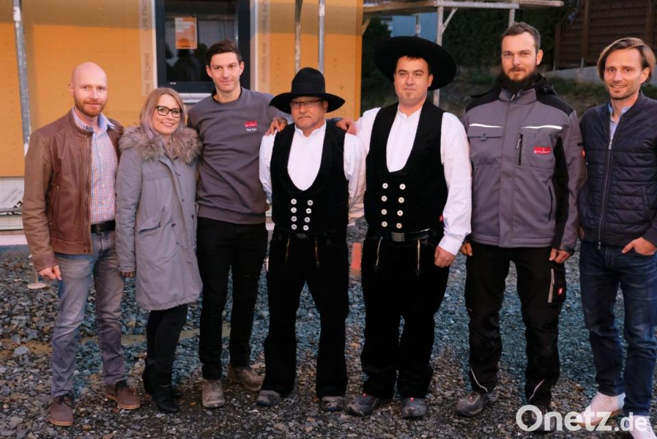 Doch zunächst hatten die Zimmerer der Baufirma Gruber das Wort. "Mit Gunst und Verlaub" verkündeten Wolfgang Dommer, Bernhard Lesinski, Josef Lukas und Paul Kunz vom Baugerüst: "Von glücklicher Bedeutung sei der Tag der Weihe allen. Zum Zeichen dessen lassen wir ein kräftig Hoch erschallen." Diesem Hoch auf die Vollendung des Rohbaus folgte in den Räumlichkeiten ein Dank des Investorenteams Michael und Corinna Dromann sowie Daniel Sper an Käufer, Baufirmen, Handwerker, Stadt und Landratsamt.