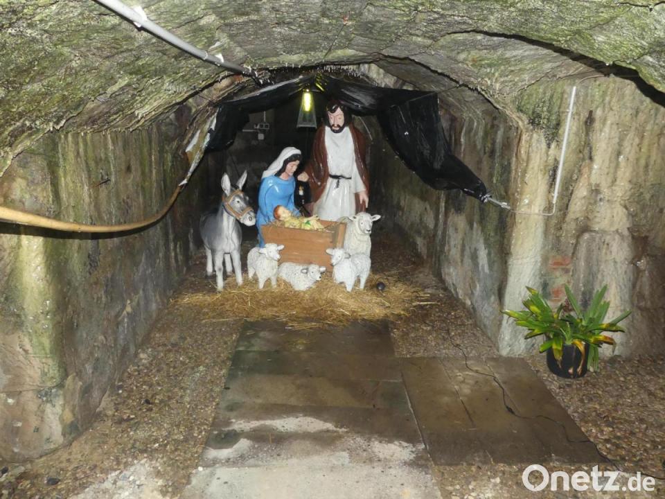 Zum Weihnachtsmarkt des Gewerbevereins am Stadtplatz gehörte vor dem Schuhgeschäft Groß stets eine lebensgroße Krippe, eingerahmt von großen Strohballen. Zum zweiten Mal verhinderte nun die Corona-Pandemie das vielseitige und gemeinschaftsfördernde Marktgeschehen. Im Schein dezenter Beleuchtung zeigt jedoch die Familie Fraunholz im Eingangsbereich ihres Felsenkellers an der Gabelung Wolfsbühl/Galgen die Heilige Familie, lädt zum stillen Verweilen und stimmt aufmerksame Spaziergänger auf das Weihnachtsfest ein.