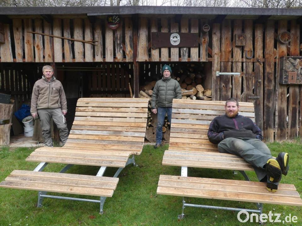 Für die Liegefläche verwendeten sie Eichenlatten aus ihrem Materialbestand. Die Führungskräfte Walter Seltmann, Hermann Schmid und Stefan Grünwald platzierten die Sonnenliegen nach dem Probeliegen am Kinderspielplatz und an der sogenannten Grubwiese.