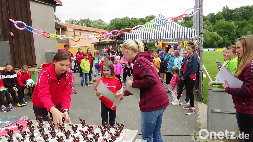 Von Genauigkeitsschießen bis zum Hindernislauf war einiges zu bewältigen. Am Ende wurden die errungenen Punkte zusammengezählt und die Preise verteilt. Natürlich durfte auch ein kleines Turnier nicht fehlen. Tobias Lehl, stellvertretender Vorsitzender des SCE, bedankte sich bei der Preisübergabe bei allen Mitwirkenden und freute sich, dass trotz des schlechten Wetters fast 35 fußballbegeisterte Mädchen den Weg auf den Sportplatz gefunden hatten. Und pünktlich zur Verleihung traf dann doch noch das DFB-Mobil ein.
