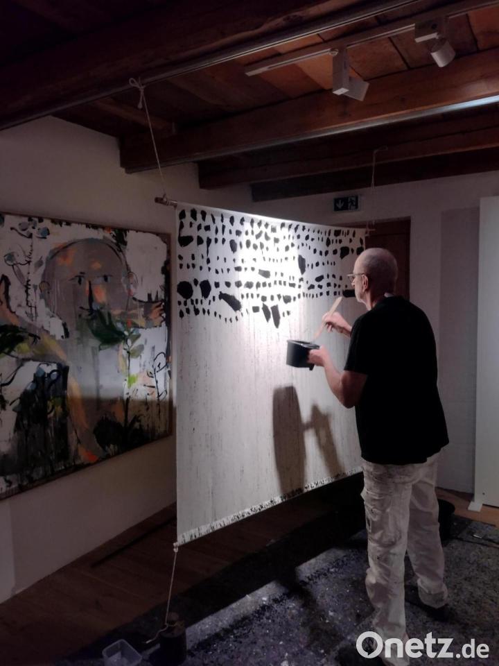 Eine Schar Ausstellungsbesucher war Zeuge des Schaffensprozesses während des Künstlergesprächs am vergangenen Sonntag. Das Bild entstand auf einer großen Malerleinwand mit kleinen Zeichen für jedes Jahr der Eschenbacher Stadtgeschichte. Gemalt wurde mit tiefschwarzer Rußfarbe als Hinweis auf die Rußweiher, deren Existenz wohl die Stadt immer begleitet hat. Mit Applaus honorierten die Anwesenden die Fertigstellung des Eschenbach-Kunstwerks.