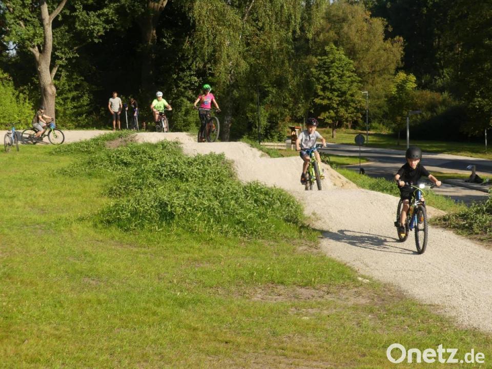 Mit dem Mountainbike düsten 15 Kinder unter Aufsicht von Martin Schmid und Christoph Renner, Lehrkräfte an Mittelschule und Gymnasium, über die neue Pumptrack-Anlage in Eschenbach. Dazu eingeladen hatte im Ferienprogramm die ÜCW.