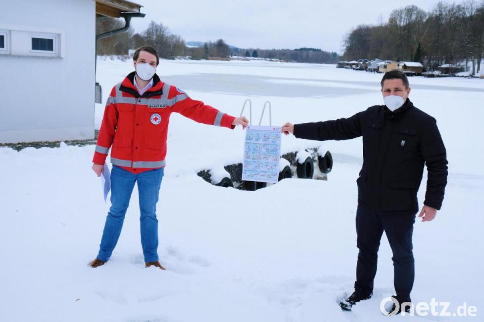 Die dicke Schneeschicht auf der Eisfläche des Rußweihers ist verführerisch. Eine Langlauftour oder eine Schlittenfahrt mit den Kindern lockt auf die weite Fläche des Freizeitsees und die Eisstockschützen sehnen sich nach ihrem geliebten urbayerischen Winter-Freizeitvergnügen. Wenn es kracht und scheppert, ist ihre „hohe Zeit“ gekommen, wenngleich dieses Vergnügen derzeit an den Corona-Infektionsschutzvorgaben scheitert. Auch die Kufenflitzer möchten eher heute als morgen wieder einmal auf dem Natureis des Rußweihers ihre Bahnen ziehen und kunstvolle Pirouetten drehen. Eislaufen auf dem See, schön wär es ja, denken viele Sportbegeisterte. Doch Josef Ott, Vorsitzender der Eschenbacher BRK-Wasserwachtgruppe und stellvertretender Leiter der technischen Wasserwacht auf Kreisebene und Bürgermeister Marcus Gradl warnen, sich nicht vom Rußweiher aufs Glatteis führen zu lassen.