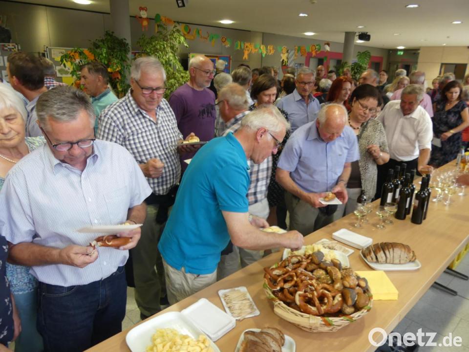 Ein kurzes Willkommen durch Bürgermeister Peter Lehr ging bei schmissiger Musikbegleitung über zu einem bei solchen Anlässen üblichen „Apero“ mit Schweizer Käse aus der „Dorf-Chäsi“ - Käsermeister Toni Hodel hatte mit Gemeinderat Benno Fleischli die Anreise mit dem Motorrad absolviert - und delikatem Eschenbacher Wein vom „Südhang“. Die gastgebende Gemeinde servierte Brezen, Bier sowie weitere Backwaren und Getränke. Dabei griffen die Gastgeber gerne zu Rebensaft. Ein akustischer Beweis dafür war das stete Klingen der Gläser. In äußerst geselliger Atmosphäre hatte das Suchen der Gastgeber nach ihren Gästen schnell Erfolg.