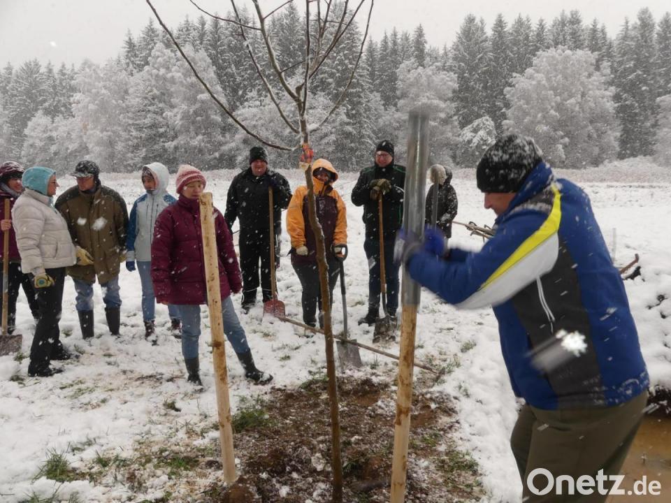 Eschenbach beteiligt sich am Bayerischen Streuobstpakt. In Kooperation mit dem Naturpark nördlicher Oberpfälzer Wald ergriff der Obst- und Gartenbauverein auf örtlicher Ebene dazu die Initiative und pflanzte auf einem Wiesengelände bei Bärnwinkel acht Hochstammobstbäume. Vorsitzende Petra Engelmann hatte zu der Pflanzaktion auch Bürgermeister Marcus Gradl geladen, der sich als Rammspezialist für Haltepfähle engagierte. „Die Aktion „Streuobst Regionales Bayern“ ist eine Initiative der bayerischen Landwirtschaftsverwaltung zur Förderung des Streuobstbaus in Bayern, die das Ziel hat, innerhalb von zehn Jahren die Landschaft mit einer Million Obstbäume zu bereichern“, informierte Engelmann die trotz Schneetreibens muntere Frauenrunde, die mit Spaten ausgerüstet war. Biologe Philipp Glab vom Landratsamt gab wertvolle Hinweise zur Pflanzaktion und nahm die erste Pflanzung selbst vor. Dabei legte er großen Wert auf Wurzelkontrolle, kurzen Nachschnitt und Einbau eines Wühlmausschutzgitters. „Die Veredelungsstelle sollte eine Handbreite über dem Erdboden liegen." Die Pfähle, die in den ersten Jahren der Standsicherheit dienen, durfte Marcus Gradl einrammen. Letzte Handgriffe dienten dem Anbringen von Verbissschutz, der aus einer Behindertenwerkstatt bezogen war, und dem Anlegen eines Gießrandes. Mit Blumen bedankten sich die OGV-Aktiven bei der Besitzerin der Wiese. Gradl zeigte sich erfreut über das Engagement der Pflanzerinnen, sprach von 100 Bäumen, die die Stadt für die Streuobstaktion bestellt hat, und rief dazu auf, sich kräftige Hochstammbäume auch für Privatgärten abzuholen.