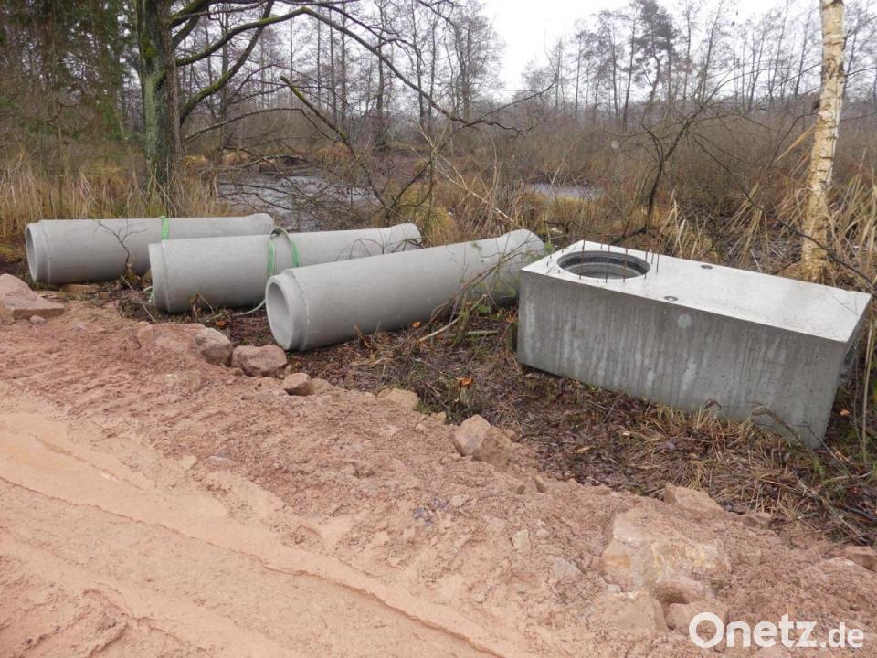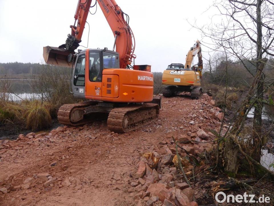Unter dieser Schicht stießen die eingesetzten Bagger auf eine bodenlose wabbelige Masse, in die nun meterweise Bruchsteine eingebracht werden. Die Wiederherstellung des 320 Meter langen Dammes wird sich daher noch einige Zeit hinziehen. Den Abschluss des Projekts „Moorrenaturierung Paulusweiher“ wird dann nach Auskunft des örtlichen Vorarbeiters der Firma Hartinger das Einbringen des neuen „Ablaufregelwerks“ (Mönch) vom Paulusweiher in den Rußlohweiher bilden. Dieser Mönch, der mit dazugehörenden Auslaufrohren bereits bereit liegt, soll den künftigen Wasserstand des Paulusweihers regeln.