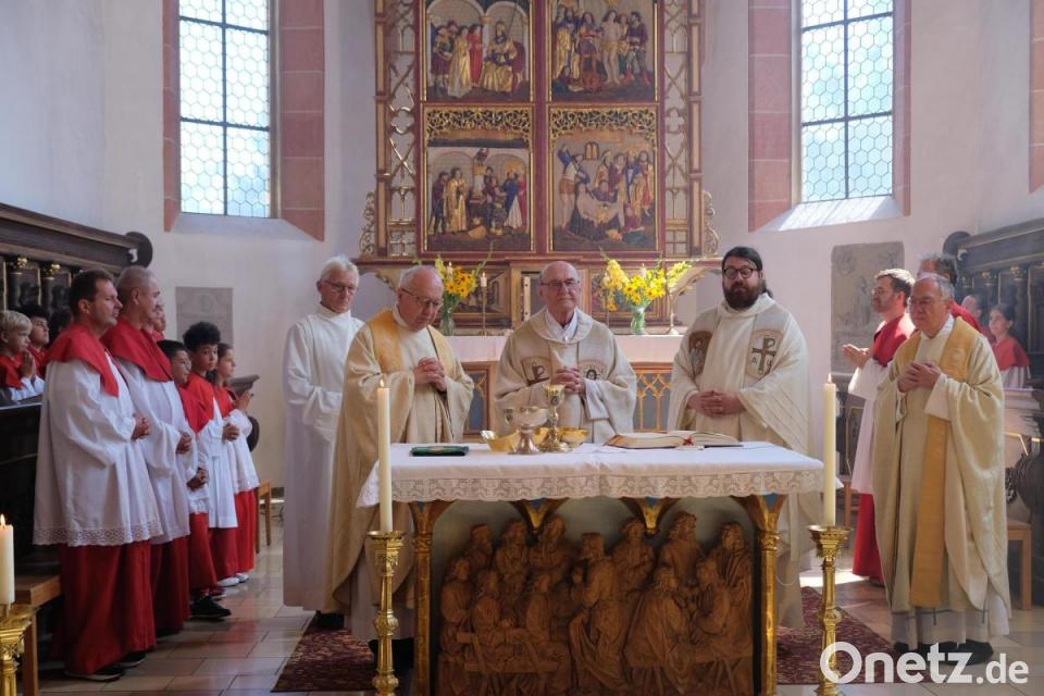 Das Bild des in stilvoller Harmonie restraurierten Altarraumes mit dem mächtigen Hochaltar im Mittelpunkt, einem prachtvollen Werk Südtiroler Schnitzkunst und in der Amtszeit des Jubilars installiert, festliches Orgelspiel, Lèo Delibes glanzvolle Messe breve mit dem Chor der Pfarrei unter Leitung von Joachim Steppert und mit Solistin Natalia Swierc prägten den Dankgottesdienst in der vollbesetzten Kirche ebenso wie die Fahnenabordnungen der kirchlichen Vereine und eine starke Ministrantenschar mit zusätzlich vier ehemaligen Messdienern der alten Garde aus der Ära Uschold. Dem Jubilar als Hauptzelebrant standen am Altar Stadtpfarrer Johannes Bosco Ernstberger und die Ruhestandspfarrer Helmut Süß und Ludwig Gradl zur Seite. Insgesamt 158 geballte Priesterjahre am Altar, wie Pfarrer Jobo schmunzelnd feststellte.