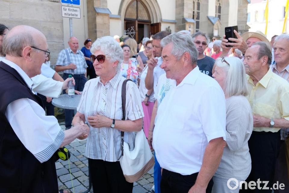 Langanhaltender Beifall der Gottesdienstbesucher begleitete die Laudatio. Die immer noch große Popularität des ehemaligen Stadtpfarrers zeigte sich auch beim anschließenden Stehempfang auf Einladung der Pfarrei auf dem Kirchplatz. Pfarrer Andreas Uschold hatte in Begleitung von Hund „Camillo“ viele Hände zu schütteln.