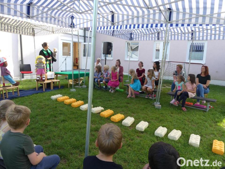 Pfarrerin Anne Utz ließ daraufhin einen Esel sprechen: „Gott schließt die Lücke. Er ist immer da. Er ist der letzte Halt.“ Mit dem Lied „Kinder bauen Brücken über tiefe Gräben, Brücken in die ganze Welt“ bewegten sie sich mit großen Bausteinen auf einander zu und bauten die Brücke fertig. Pfarrer Jeschner zitierte Bibelstellen, in denen Gott Stärke, Hilfe und Halt bedeutet. Während die Erzieherinnen das Lied „Gott dein guter Segen“ anstimmten, segneten die Geistlichen jedes Kind.