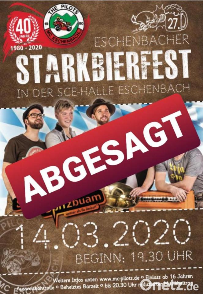 Die nächste größere Veranstaltung im Vierstädtedreieck ist abgesagt: Die "Pilots" teilen auf ihrer Facebook-Seite mit, dass das Eschenbacher Starkbierfest "aus aktuellem Anlass" am Samstag, 14. März, nicht stattfinden wird. Einen Ersatztermin soll es nicht geben, da die Starkbierzeit nur bis Ostern gehe und sich bis dahin die Lage nicht mehr ändern werde, ist außerdem zu lesen.