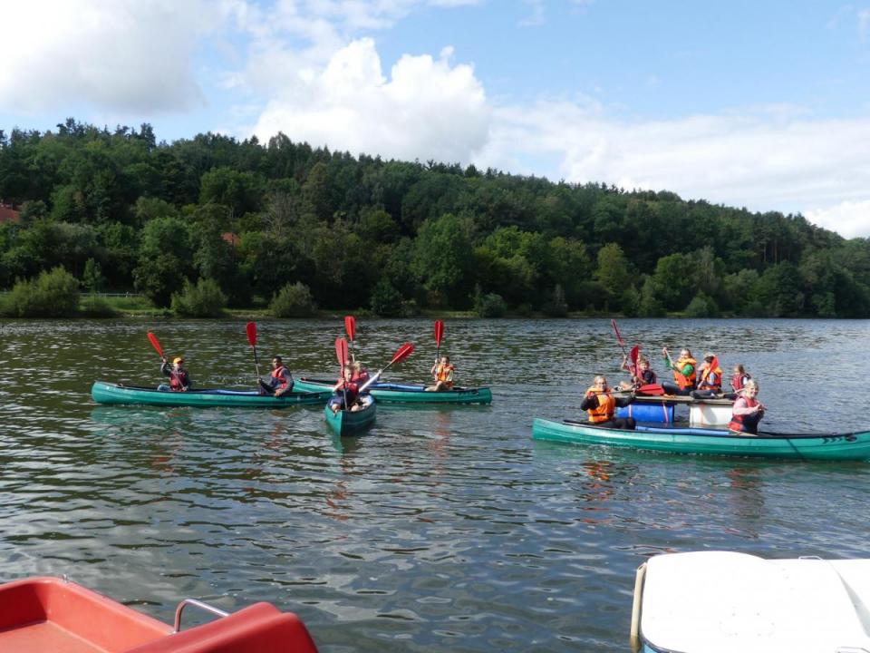 „Ab in die Wellen des Lago de Rußo“, ist seit Jahren fester Bestandteil der Ferienbetreuung. Die Gruppe „See-Räuber“ erwartete im Zuge einer Kanu-Challenge zunächst Unterricht: Im "Trockenkurs" wurden Informationen zur Paddeltechnik vermittelt. Dann ging's zu Kanutouren auf den Rußweiher, wo wechselnde Windstärken „lebendiges Wasser“ schufen. „Wir kämpfen gegen reißende Strömung“, meinten die "Kanu-Räuber" dazu. Die "Mini-Seeräuber" ließen es gemächlicher angehen: Sie erlebten die Weiten des Rußweihers vom Floß aus.