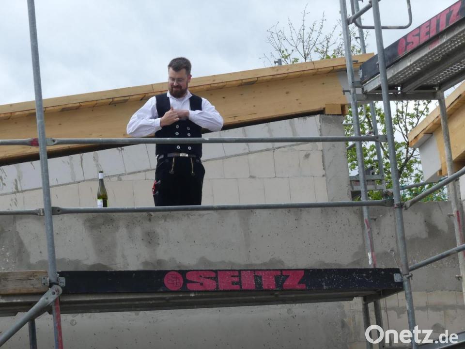 Mit einem traditionellen Richtspruch wandte sich Sebastian Schmidt von der Firma Holzbau Kulmbach an die Anwesenden: „Die Feierstunde hat geschlagen, der Richtbaum grüßt das Land. Stolz sind alle, die hier mit gebaut haben – tüchtige Handwerker, die auf ihre Kunst vertrauen. Ich wünsche dem Gebäude viel Glück und Gottes Schutz vor Schaden und Not. Zum Schluss warf er sein geleertes Glas Wein zu Boden, gemäß dem Sprichwort: "Scherben bringen Glück!“