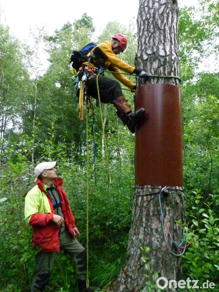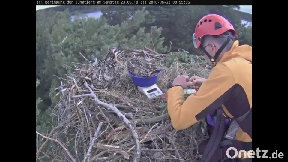 Die Beringungsaktion begleitete Martin Gottsche als Repräsentant des Amts für Ernährung, Landwirtschaft und Forsten und Berater des Naturparks Nördlicher Oberpfälzer Wald. Er beobachtet die Fischadler seit ihrem ersten "Einschweben" auf die Obersee-Insel. Beim Annähern der ungeliebten Gäste verließen die Altvögel den Horst und umkreisten ihn mit schrillen Pfiffen, die sich deutlich vom Geschrei der Möwen abhoben. Je mehr sich Dr. Schmidt mit Steighilfen dem Horst näherte, umso höher flogen die Adler in den Morgenhimmel.