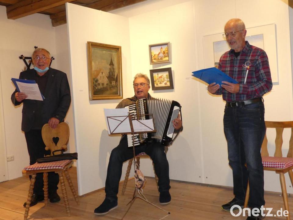 Da man für die Umrahmung eines Mundartabends natürlich Mundartlieder braucht, bot das Trio Georg Baierl, Franz Geigenberger und Heiner Kohl den „lieben Freunden des oberpfälzischen Dialekts“ musikalische Leckerbissen. Als Sprecher erinnerte Kohl an die Gaststätte Obersee, die in den 1960er und 1970er Jahren mit den Wirtsleuten Klara und Toni Löw eine Hochburg des Dialektgesangs war, und kündigte das Hauslied „Mir Alt’n“ an. Mit dem Entenlied „San zwoa Ant’n übern Weiher üwe g’schwumma“ blieben sie im Oberseegebiet. „Oitza how e mei Haisl“ garnierten sie mit Breeder, Howerstrouh, Schnupfdowak, Heirat und Saustool. Nicht fehlen durfte „Wenn da Voda mit da Mouda“ als „Visitenkarte des oberpfälzischen Dialekts“.