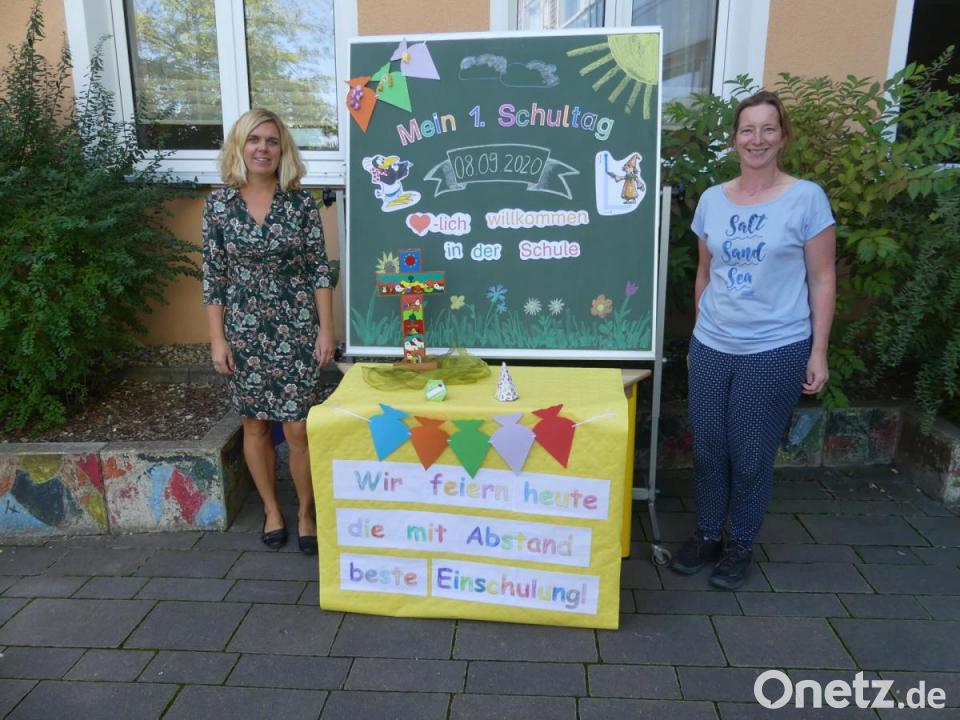 Während sich die Schüler der Klassen 2 bis 10 bereits um 7.55 Uhr in ihren Klassenzimmern treffen, beginnt der erste Schultag für die Erstklässler erst um 8.30 Uhr mit der Begrüßung auf dem Pausenhof. Dafür haben die Lehrkräfte Pamela Walberer (Klasse 1) und Kathleen Walberer (Klasse 1/2) bereits einen Tisch und eine Schultafel vorbereitet und versichern: „Wir feiern mit Abstand die beste Einschulung.“