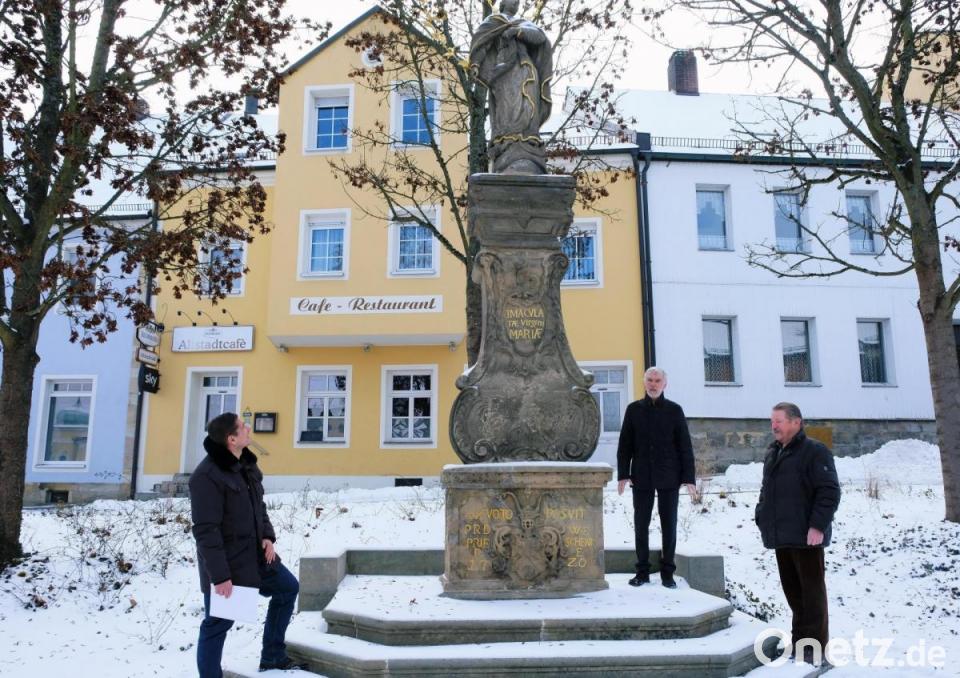 Deshalb fiel es auch der Stadt nicht schwer, im Rahmen der Altstadtsanierung Ende der 1990er Jahre auch an die Mariensäule zu denken und die unter Denkmalschutz stehende Statue „Mariensäule aus Sandstein, Immaculata 1720“, so die Eintragung in der Bayerischen Denkmalliste, gründlich zu restaurieren und auch das unmittelbare Umfeld angemessen zu gestalten. Der technische und finanzielle Aufwand war hoch. Dafür können die Eschenbacher noch immer voller Stolz und Genugtuung auf ihre „Schutzfrau“ blicken. Doch auch schon vorher gab es in den vergangenen Jahrhunderten Marienverehrer, die sich dem besonderen Schatz aus gläubigem Dank annahmen. Auch die jüngste Restaurierung durch den Experten Georg Doreth aus Neustadt am Kulm fand edle Spender. So finanzierten Bauunternehmer Gerhard Prösl und Diplom-Ingenieur und Kreisheimatpfleger Hannes Oberndorfer die vor einigen Wochen abgeschlossene gründliche Überholung des Kunstwerkes.