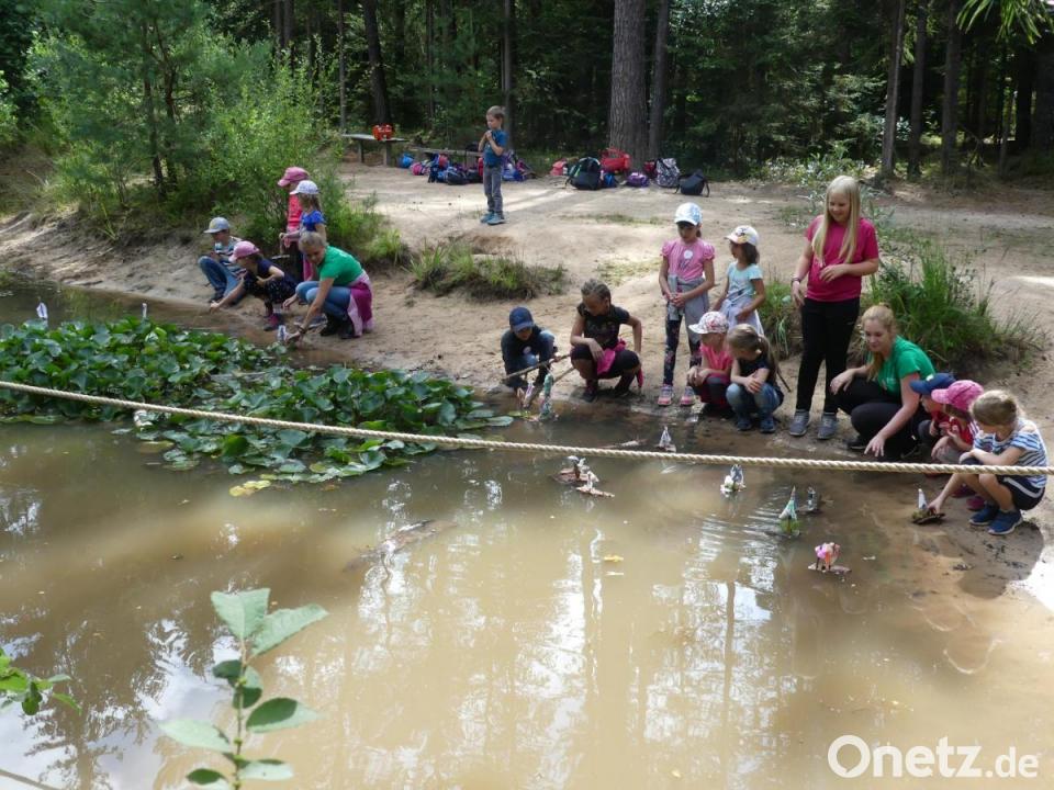 Eine nahezu unbegrenzte Vielfalt an Gestaltungsmöglichkeiten bot das Thema „Der Natur auf der Spur“ am Walderlebnispfad in der Flur Dessenreuth. Hinweisen zum richtigen Verhalten im Wald schlossen sich das Anlegen von Biwak und Lagerplatz beim städtischen Waldkindergarten an. Handwerkliche Geschicklichkeit zeigten die Kinder, als sie Insektenhotels und kleine Segelboote aus Rinde herstellten. Nach dem Zu-Wasser-Lassen der Flotte in der kleinen Weiheranlage kam Spannung auf: Welches Boot ist das schnellste?