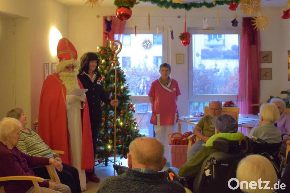 Josef Ott, der neue Heimleiter, Ines Zeitzer von der Verwaltung sowie die Heimfürsprecherinnen Brigitte Metzner und Roswitha Brunner waren die Begleiter des berühmten Heiligen im Haus und halfen ihm beim Austeilen der Geschenke. Überall trug der Nikolaus (Gerhard Brunner) ein Gedicht vor und richtete liebe Worte an die Bewohner, die ihm mit glänzenden Augen zuhörten.