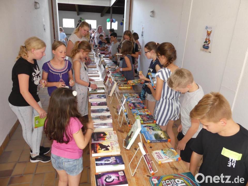 Die Kinder wussten, dass sich im Raum dahinter die neu angeschafften Bücher der Bibliothek befinden. Nun galt es, beim Gang entlang einer langen Büchertheke, einen interessanten Titel zu finden und sich bei Renate Kraus in die Lesekartei eintragen zu lassen. Zur Auswahl standen Titel wie "Stallgespenst", "Juwelenraub", "Das Bienengeheimnis", "Schule und magische Tiere", "Der Wunschpunsch" und auch eine Harry-Potter-Serie.