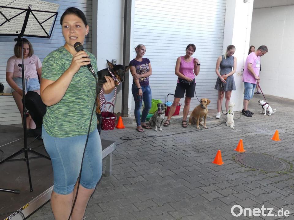 Mit Blumen dankte Danzer ihren Mitarbeiterinnen und kündigte Daniela Simon mit Vorführungen an. Die Hundertrainerin stellte die Hunde Liesi, Mila, Luna, Leni und ihren Zwergpinscher vor und versprach eine Demonstration von Lernerfolgen an. Dazu gehörten, je nach Ausbildungsstand, der Verbleib zwischen den Beinen des Hundeführers, das Kreisen um einen Schemel, Spielsachen in einen Korb ablegen, Apportierübungen und Slalomlaufen durch die Beine des Hundeführers.