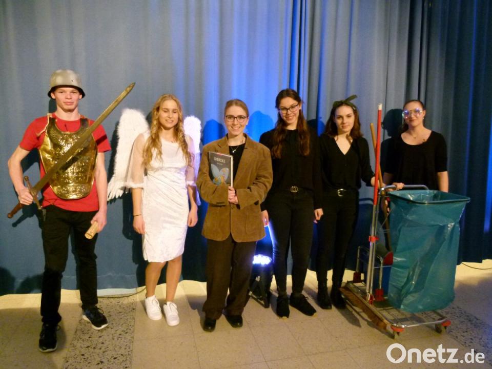 Goethes "Selige Sehnsucht" verkörperte Patricia Schreml. Als glitzernder Engel reklamierte sie von der Galerie herab von Liebesnächsten, Finsternis und Licht und folgerte: "Und so lange du das nicht hast, dieses: Stirb und Werde! Bist du nur ein trüber Gast auf der dunklen Erde." Als Professor verkleidet betrat Katharina Wolf die Bühne und fragte nach Hugo von Hofmannsthal: "Was ist die Welt?" "Die Schritte" von Albrecht Goes trug Rebecca Plößl vor, im Arm eine große Puppe: "Klein ist, mein Kind, dein erster Schritt, klein wird dein letzter sein ..."