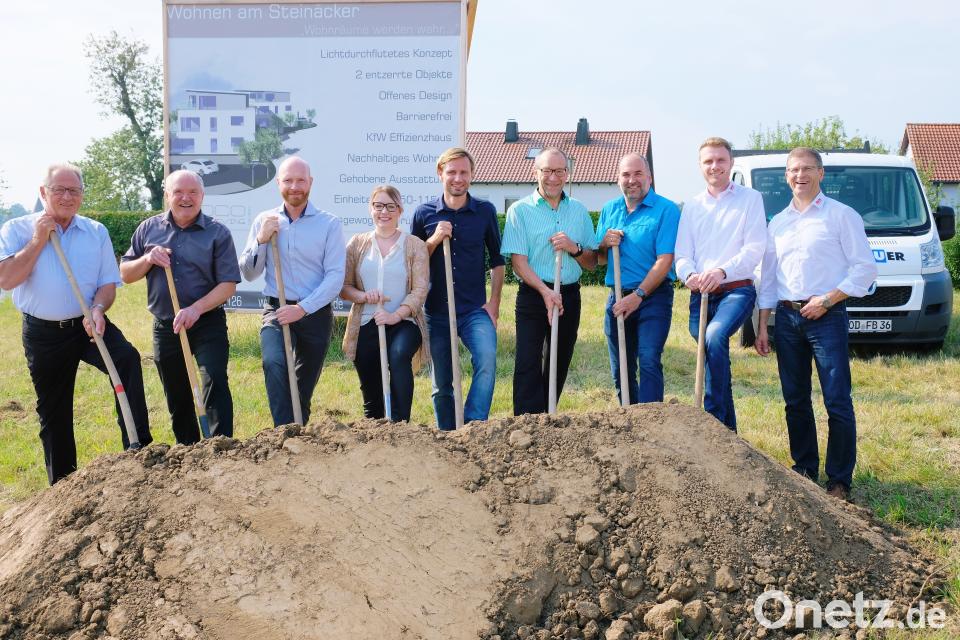 (do) An der Einfahrt zur Wohnsiedlung an den Kreuzäckern ist ab sofort ein besonderes Bauprojekt zu bestaunen: "Wohnen am Steinäcker". Die Midco Living GmbH lässt zwei Mehrfamilienhäuser mit je acht hochwertig ausgestatteten Wohnungen errichten. Nun war Spatenstich für das Millionen-Projekt.