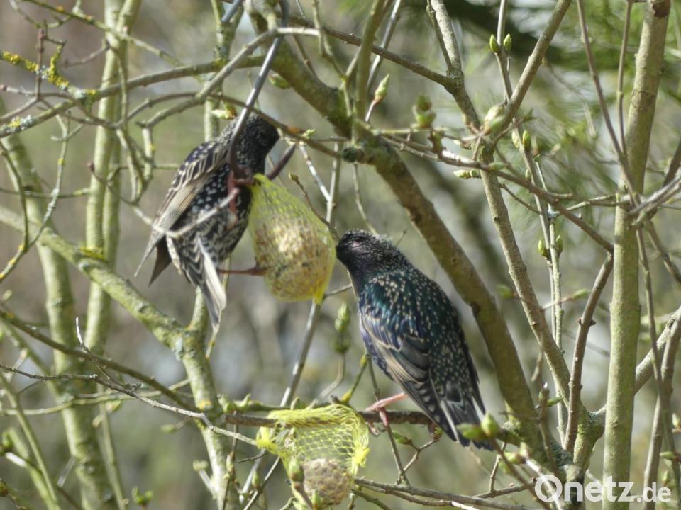 Mit großer Begeisterung hacken sie in die Knödel und wischen sich zwischendurch ihre Schäbel am nächstgelegenen Zweig ab. So lange sie „zu Tisch sitzen“, warten in kurzer Distanz Meisen, Stieglitze und Finken auf Platzwechsel.