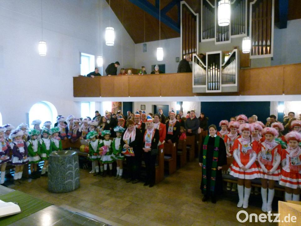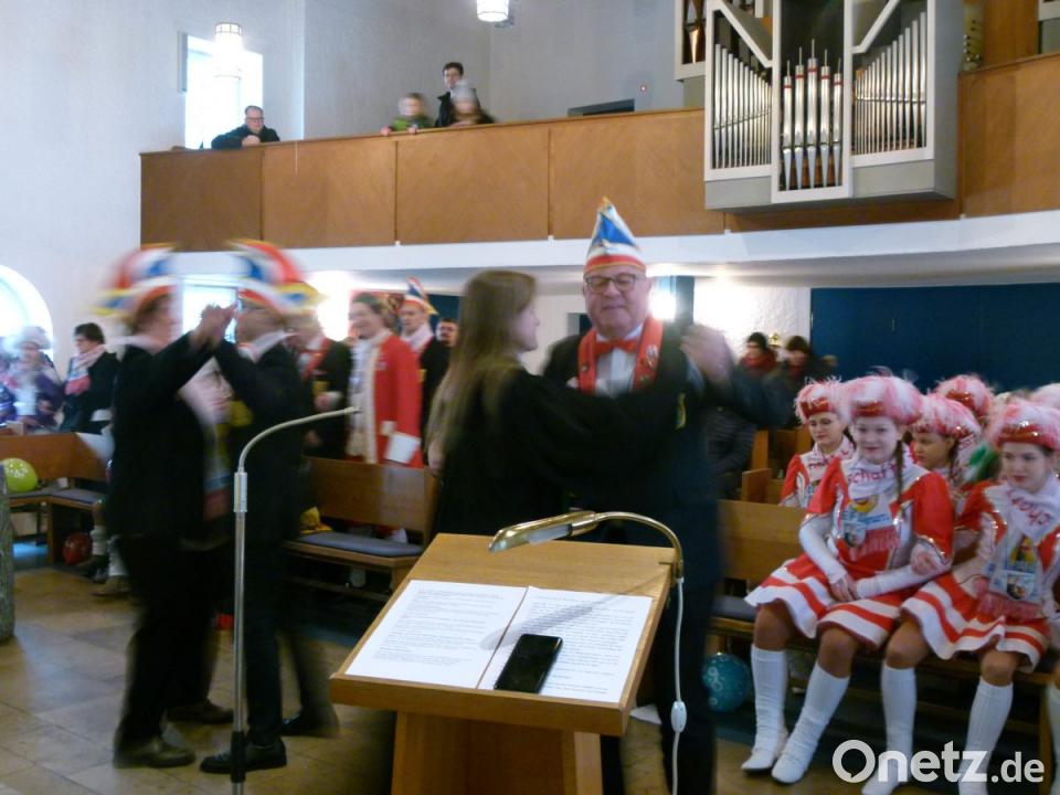 Unter großem Beifall dankte Elisabeth Eißner allen Mitgestaltern des Gottesdienstes. Mit einem Blumenpräsent wandte sie sich an Pfarrerin Utz. Prinz Sebastian umarmte die Pfarrerin und überreichte ihr den EFG-Orden. Zum schwingenden Auszugslied „Lobe den Herrn meine Seele“ forderte sie frohgelaunt die Kirchenbesucher auf: „Es darf gesungen, getanzt und geschunkelt werden.“