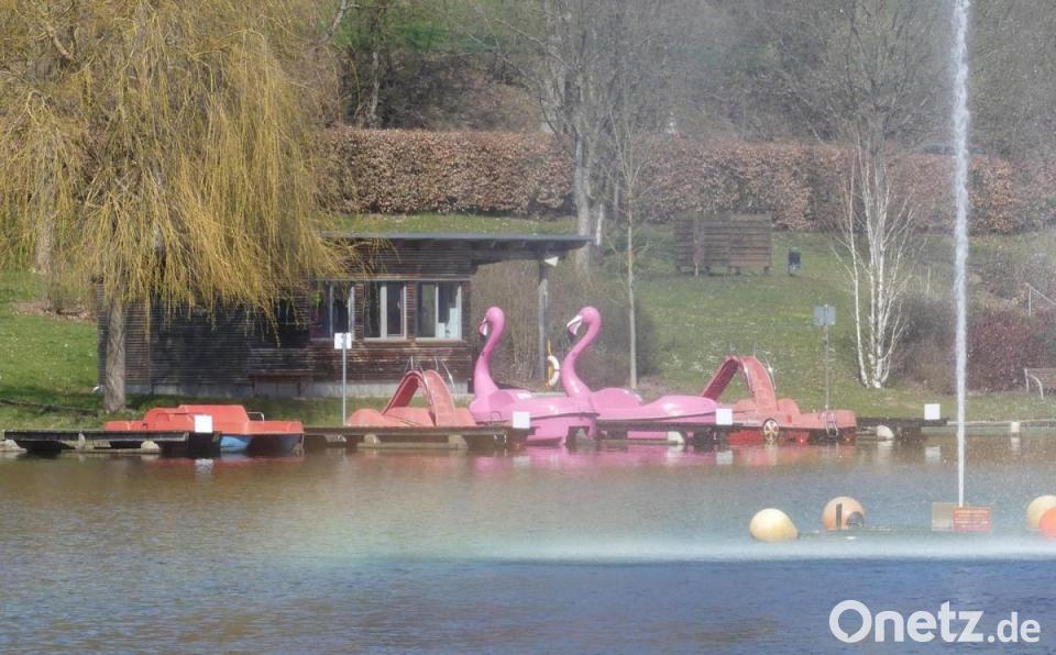 Nach gut halbjährigem Verbleib der "Rußweiherflotte" im Bauhof der Stadt und nach erfolgtem Pflege- und Wartungsdienst haben Mitarbeiter des Bauhofes die ersten Kähne und Flamingos zu Wasser gelassen. Die Gischt der Freibad-Fontäne verleiht im Schein der Frühjahrssonne dem Blick auf das Bootsverleihgebäude eine geradezu zauberhafte Stimmung.