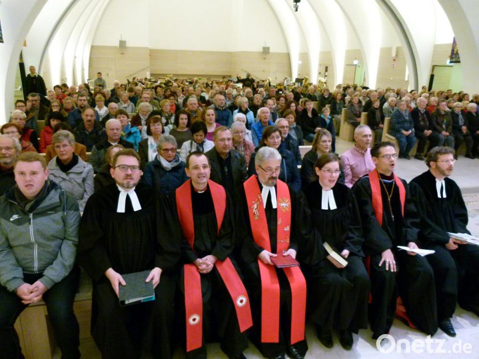 Für den überwiegenden Teil der Gläubigen war es der erste Besuch der Netzabergkirche, die das amerikanische Schulzentrum überragt. Das Innere des Gebäudes beeindruckte ebenso wie die mitreißende Art des amerikanischen Pfarrers Dr. Wesley Teixeira, mit der er die Chapel geradezu zur Wittenberger Schlosskirche machte. Sein neuzeitlicher "Jubelruf" zum Ende des Gottesdienstes sprach Bände. Die Seiten des Kirchenraumes schmückten unzählige Fahnen mit Aufschriften wie "Find joy everyday", "Trust in the Lord" oder "Go and make discipleys of all nations". Zum Einzug der Pfarrer, angeführt von Eschenbachs Pfarrerin Anne Utz, erklang ein mächtiger Choral. Gemeinsam gaben die Posaunenchöre Frankenberg, Neustadt am Kulm und Wirbenz-Kemnath-Immenreuth dem Gedenkgottesdienst einen würdigen Rahmen. Am Flügel begleitete Walter Thurn das Zeremoniell.