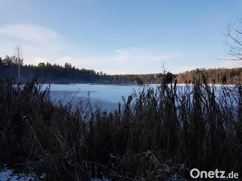 Wo sich in der warmen Jahreszeit Wasservögel tummeln, herrscht jetzt eisiger Frieden unter den Strahlen der Sonne. Schilf und Eis ergeben am Rußweiher eine wunderbare Komposition.