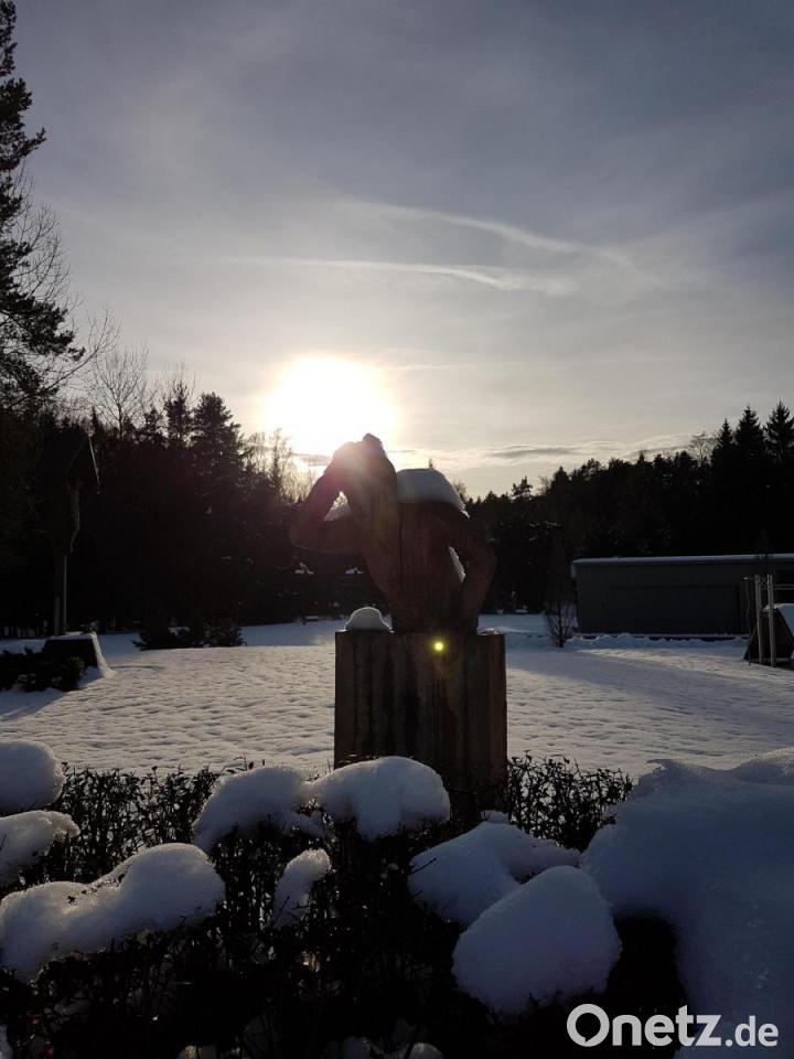 Sonnenschein über einem Schneefeld lässt einen Dunstschleier aufsteigen. Der hölzerne Mann jedoch dreht sich lieber von der Sonne weg und schaut in den hellen Abendhimmel.