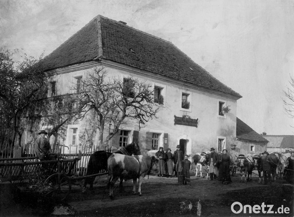 Der Fotograf dieser Aufnahme aus der Zeit Anfang des 20. Jahrhunderts lockte einige Dorfbewohner mit ihren Kuh- und Pferdegespannen vor das Wirtshaus. Für den heutigen Betrachter dieses Bildes ist auch die altertümliche Bekleidung der Bauern und Bäuerinnen interessant.