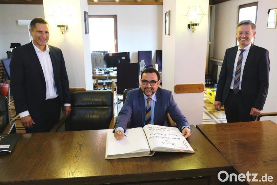 Marcus Gradl berichtete zudem von einem geplanten Netzwerk „Schule und Gewerbe“, um Arbeitsplatzangebote einschließlich Dualem Studium für Schüler interessanter zu machen. Der hohe Besuch endete mit einem Eintrag in das Goldene Buch der Stadt.