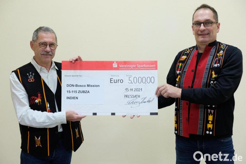 Für die Kinder, die täglich wegen der fehlenden Verkehrsverbindungen lange Fußmärsche zurücklegen müssen, um zur Schule zu kommen, ein Glücksfall. Eine gute Schulbildung ist für die Kinder das Tor zu einer anderen, besseren Welt. Einen Glücksfall nennt Rupprecht auch die Zubza-Partnerschaft von Hubert Schug. Großherzig spendet der Unternehmer regelmäßig und baut damit „Hand in Hand fürs Nagaland“, so der Leitgedanke, wunderbare Brücken, wie Rupprecht dankbar feststellt. Jüngstes Beispiel ist eine Geldspende der Schug-Gruppe in Höhe von 5000 Euro, die der Unternehmer in der Volkstracht des Naga-Stammes mit einem symbolischen Spendenscheck übergibt.