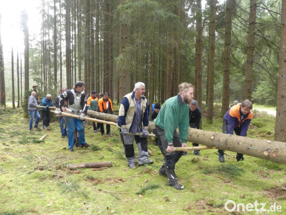 Nach ersten Arbeiten am Stamm schufteten nahezu 30 Clubmitglieder das Frühlingssymbol mit Maschinenunterstützung zum Weitertransport auf den nahen Forstweg. Hubert Schwindl (Moos) und Franz Völkl (Eschenbacher Mühle) übernahmen mit landwirtschaftlichen Zugmaschinen und einem Sicherungsfahrzeug der Feuerwehr den Weitertransport. Bereits um 9.30 Uhr empfingen die Pilots ihr Schmuckstück am Friedhofsweg. Kaum war es auf 26,50 Meter gekürzt, begann ein zügiges Entrinden und das Anbringen der Halterungen für die Wappenscheiben. Zu neuem Leben erweckt wurde die inzwischen festlich geschmückte Fichte beim Maifest auf dem Marienplatz, das die Stadtkapelle um 15 Uhr musikalisch eröffnete. Ab 16 Uhr setzten sich die Motorradfreunde mit viel „Hau-Ruck“ in Szene.