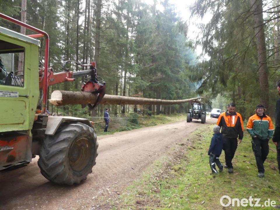 Bereits in den Morgenstunden herrschte am „Holzweg“ in der Flur Oberes Dessenreuth reges Treiben. Die „Pilots“ waren ausgerückt, um den bereits am Vortag ausgesuchten Baum zu fällen und in die Stadt zu holen. Um 8.15 Uhr setzte Florian Burkhardt die Motorsäge an. Das „Opfer“ war eine 29,55 Meter lange Fichte. Nach den Jahresringen hatte sie ein Alter von knapp 60 Jahren. Ihre Pflanzzeit geht damit zurück auf das Geburtsjahr von Pilots-Vorsitzenden Harry Wohlrab.
