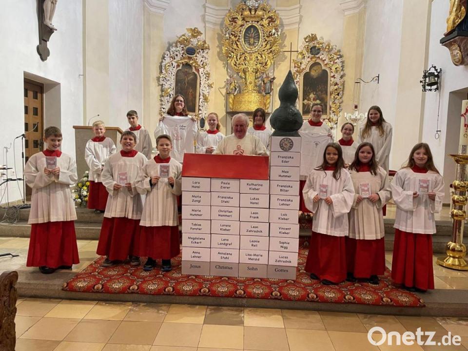 Die Neuaufnahmen der acht Ministranten Franziska Biller, Franziska Eder, Max Hummer, Luis Kleber, Vincent Kleber, Franziska Lehner, Sophie Nigg und Lucas Zahradnik erfolgte in einem Gottesdienst. Pfarrer Erwin Bauer sowie die Oberministrantinnen Marie Hummer und Paula Zierer freuten sich über die Verstärkung. Bereits Tage zuvor hatten Nicola und Martin Hummer aus Kartonagen 26 Bausteine gebastelt und jeden mit einem Namen versehen. Auf den vier Grundsteinen des "lebendigen" Gotteshauses standen: Jesus Christus Sohn Gottes. "Wir sind sehr stolz auf unsere Ministranten und Ministrantinnen und wollten das so zum Ausdruck bringen", stellte Kirchenpflegerin Nicola Hummer fest. Auf das feste Fundament Jesu setzten die 26 Minis jeweils einen mit ihrem Namen versehenen Baustein. Durch den Zwiebelturm konnte das gemeinsam erstellte Bauwerk unverkennbar der Eslarner Kirche zugeordnet werden. Bei der Aufnahme in die Messdienerschar überraschte Pfarrer Bauer alle mit Ministrantenausweisen, die von Nicola Hummer mit Pfarrgemeinderätin Manuela Klug entworfen wurden und selbst gefertigte Unikate sind. Zudem sollen künftig einheitliche T-Shirts das Zusammengehörigkeitsgefühl noch besser stärken. Die Entwürfe dazu stammen von Oberministrantin Marie Hummer.