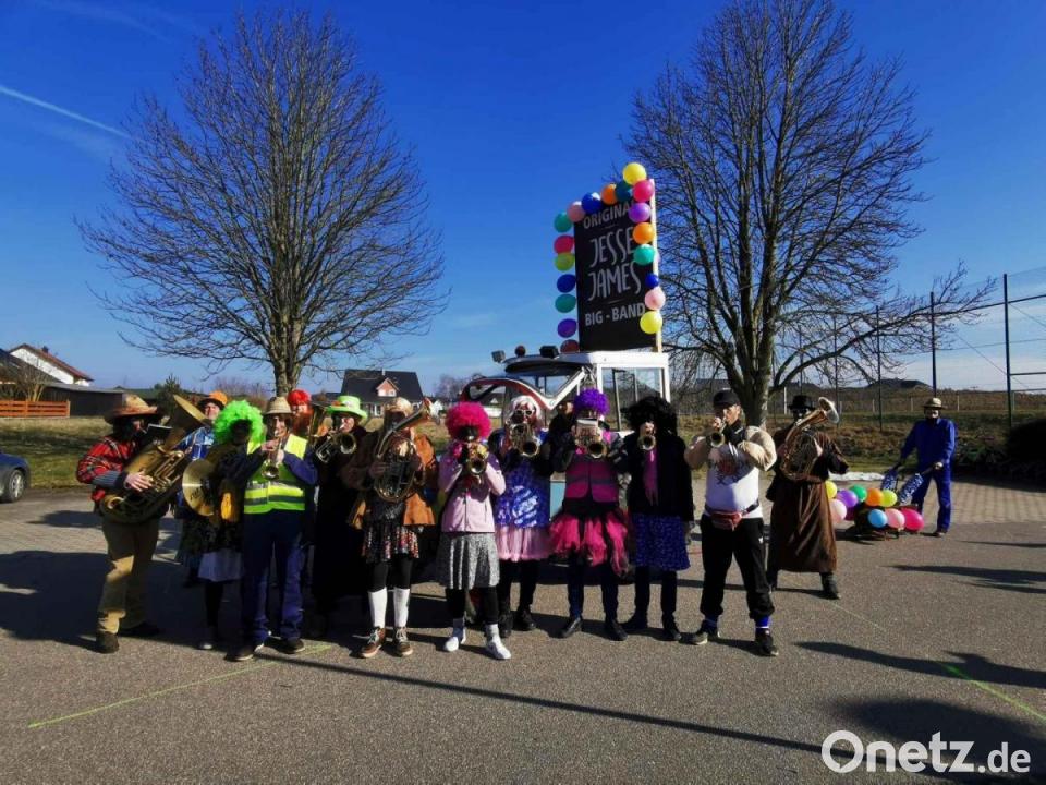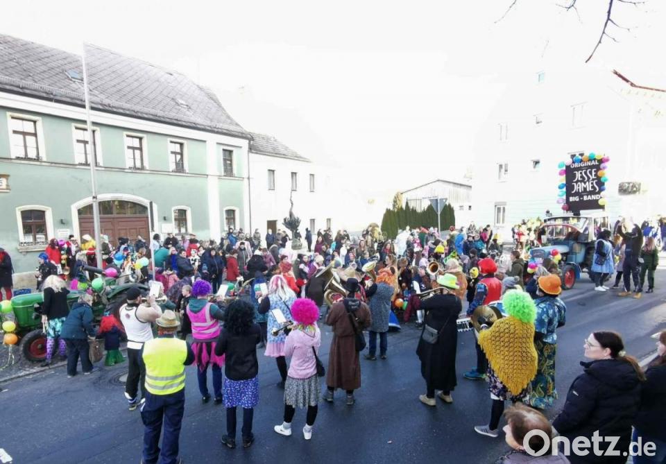 Am Marktplatz wurden die Faschingsgruppen von rund 300 Zuschauern bereits sehnlichst erwartet. Zur Diskussion unter den Schaulustigen stand die Verlegung des Standkonzerts vom Marktplatz zum Kommunbrauhaus. Damit wurde auch aus der symbolischen Schlüsselübergabe am Rathaus in diesem Jahr nichts. Für flüssige Verpflegung vor Ort hatten der Dartverein und vorsorglich die Musiker selbst gesorgt. Für die anwesenden Kinder gab es Süßigkeiten und die Autofahrer und Zuschauer wurden um einen kleinen Obolus für die späteren Ausgaben gebeten.