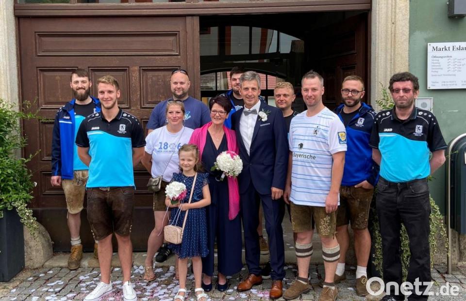 Heidi Winklmann aus Oberviechtach und Günther Hierold aus Eslarn gaben sich im Rathaus das Jawort vor Standesbeamtem Fabian Dimper. Trauzeugen waren die Kinder der beiden, Tobias (23 Jahre) und Julian (24). Beim anschließenden Empfang auf dem Marktplatz waren überwiegend Trikots der 60er zu sehen. Für den schönsten Tag des Brautpaars hatte sich die gesamte Führungsriege des Löwenfanclubs reichlich Zeit genommen, um bei der Trauung von stark vertreten zu sein. Zudem war der Bräutigam viele Jahre Schriftführer, ist aktuell Kassenprüfer und seit kurzem Ehrenmitglied.